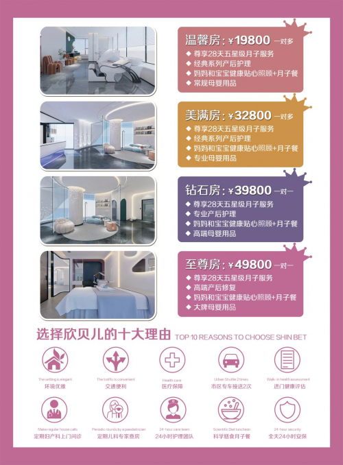 该月子会所从事母婴护理行业经验丰富,拥有专业管理团队,以及由丰富临床经验的妇、产、儿、心理、营养、保健等学科专业和护理人员组成的专家团队。通过专护实操,欣贝儿国际月子会所总结了多项特殊母婴护理经验,由专业的母婴护理师、营养师、医生、厨师等组成服务团队”,以“真情服务母婴,爱心奉献社会”业宗旨,为贵宾提供健康护理、母婴保健、营养、产后形体修复、心理疏导等24小时贴心照护服务。